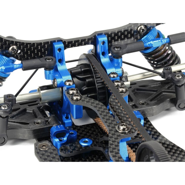 サスペンションは信頼性の高いTRF420用を使い、バルクヘッドは組み立て時の精度を高め、セッティング幅を広げた専用品。ドライブシャフトも43mmの軽量専用タイプです。