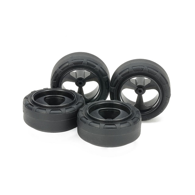 スーパーハード樹脂を使用した直径24mmのタイヤに、カーボン強化樹脂製のホイールを組み合わせました。標準仕様に比べて硬く、跳ねにくいタイヤがジャンプの後の走行安定性を保ちます。また、ブラックカラーが精悍な3本スポークのナローホイールは、シャフトが抜けにくいのも特徴です。