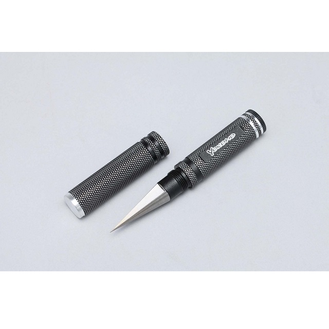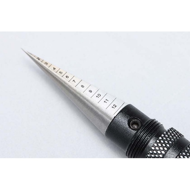 尖った先端をポリカーボネートボディに突き刺し、回転させることできれいに穴を広げることが可能です。刃の部分には直径を示す刻印が施してありますので、簡単に目的の穴のサイズが分かります。握りやすいすべり止めのアルミ製ハンドルに加え、キャップも同じデザインとなっています。