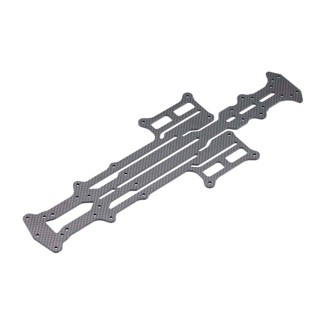 YD-2シリーズのグラファイトシャーシ共通である2.5mm厚の板材を使用しながら、全体的にスリム化され、さらに大幅な肉抜きが施されたことで、Pタイルやカラーコンクリートなどの低ミュー路面で効果を発揮します。特にリヤ周りはスリット加工で極限まで細く設計され、リヤトラクションを最大限に高めることが可能になります。コーナーでドリフトの安定感を高めたい場合にうってつけな特性のメインシャーシです。