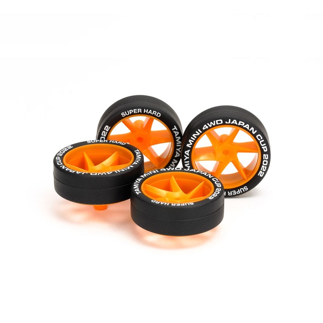 スピード感のあるシャープな6本スポークデザインが人気のスパイラルホイールに、スーパーハードタイヤをセットしたJAPAN-CUP 2022記念アイテムです。スーパーハードタイヤはキット標準タイヤに比べてローグリップのため、コーナリング性能に優れ、さらにジャンプ後の着地で跳ねにくいのも特徴。ブラックカラーのタイヤ側面には「TAMIYA MINI 4WD JAPAN CUP 2022/SUPER HARD 」の文字をホワイトでプリントして、レーシーなムードを高めています。ホイールは鮮やかなオレンジカラー。ミニ四駆、ミニ四駆PRO各車に使えます。※印刷が取れるため、クリーナー等は使わないでください。★硬いタイヤのため、強く押し込んで装着します。