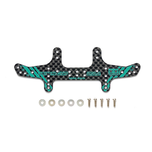 9mm、13mm、19mmのローラーをワイドにセットできる、軽く強度の高い1.5mm厚のカーボン製リヤステーです。レースで人気のマルチワイドリヤステーの形状をベースにアウトラインを変更し、取り付け穴を増設。カーボン製ならではのレーシーな仕上がりに加え、ブルーグリーンカラーで印刷したローラーサイズやタミヤマーク、J-CUPのロゴ、ストライプも目を引くパーツです。MS、MA、VZ、FM-A、AR、VS、スーパーll/X/XX/TZ-Xシャーシ各車に使用可能。※別売のローラーと一緒に使用してください。※印刷が取れるため、クリーナー等は使わないでください。