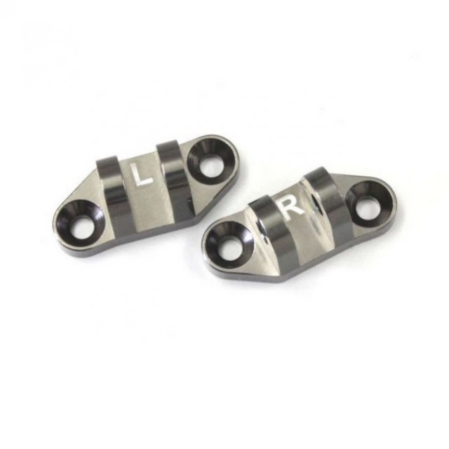 ノーマルのプラスチック製ではハードヒットによる破損が避けられないアッパーピボットを、アルミブロックから精度の高いCNC加工により贅沢に削りだしする事で耐衝撃強度を大幅にアップしかつより正確なサスペンションの動作を実現する。仕上げはガンメタリック色のアルマイト処理が施され質感もアップします。レーザー彫刻でL、Rの文字が刻まれ、左右の判別が解かり易くなっている。