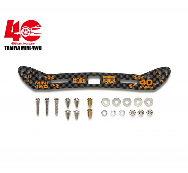 ITEM 15469「フロントワイドスライドダンパー」のアルミステーに換えて使用する、カーボン製ステーです。2mm厚のフルカーボン製ステーは、アルミ製に比べて約40%軽く、高剛性。レーシーなカーボン模様に加えて、40周年の記念ロゴをオレンジでプリントしてプレミアム感を高めます。さらに、9、13、17、19mmローラー用の穴を開けて、様々なローラーセッティングに対応。付属のビスを使ってシャーシに直接固定して使うことも可能です。