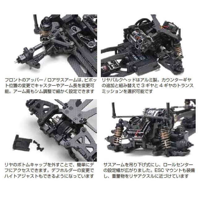 駆動系はアルミ製バルクヘッドで保持される高精度設計。キット標準では正トルクの3ギヤトランスミッションとなりますが、カウンターギヤを追加して組み替えることで、4ギヤの反トルク仕様で使うこともでき、走行スタイルに合わせてトラクションバランスを設定可能です。