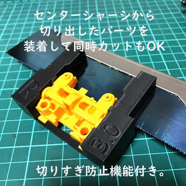 ・ガイドの隙間をせまくしているので、「タミヤ製 薄刃クラフトのこ」もしくは0.25mm厚以下のノコギリをご使用ください。