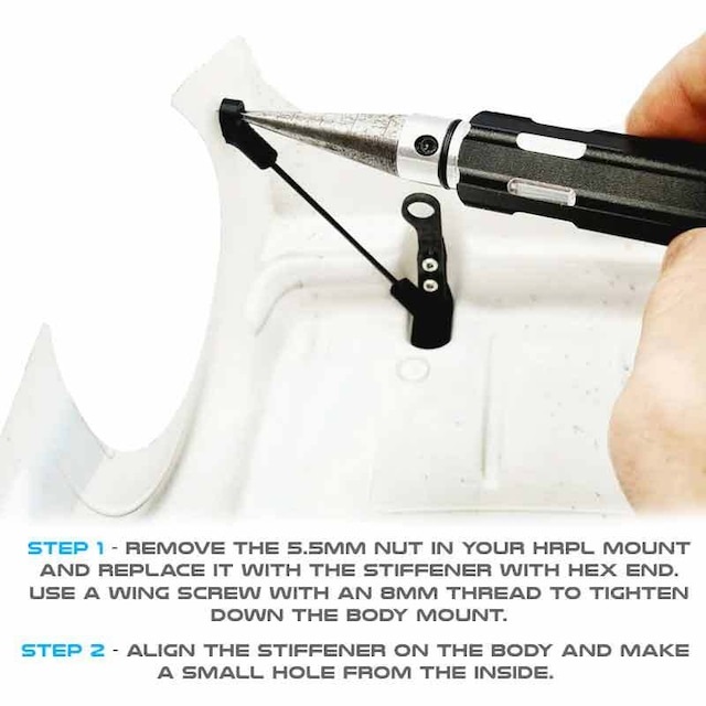 このリアフェンダースティフナーは、非常に細いカーボンロッドと最新の3Dプリント技術により、1個あたりわずか1gという驚異的な軽さを実現しました。そして何より、当社の水平リアポストボディマウントLiteに直接取り付けることができます。ナットを外し、ロッドをねじ込むだけです。プラスチックナットは、非常に深いスレッドを持っており、すべてがしっかりと所定の位置に締め付けられることを確認します。