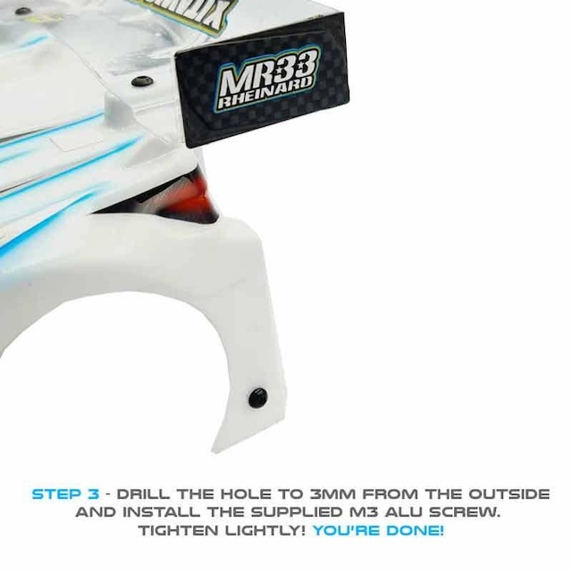 補強材セットは組み立て済みで、ウィング取り付けネジを除く、取り付けに必要なすべてのハードウェアが含まれています。長さ8mmのネジを使用することをお勧めしますが、多くの人が自分の好きなネジを使用したいので、供給していません。付属のM3x5合金ネジは、重量を抑え、リアのホイールアーチの後ろにアンチタックを取り付けるために最適です。
