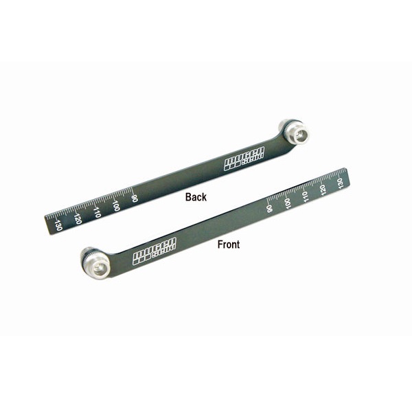 バギー/トラギーのフロントとリヤダンパー上側のM3ナイロンナットにセットして 目盛を下側のスクリューの中心に当てます。目盛は両面に彫刻されているので、 左右ダンパーの長さをセットアップシートの数値にセットすることができます。