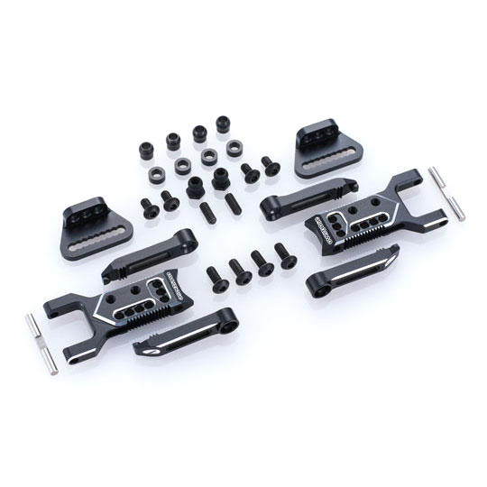フルアジャストタイプのアルミリヤサスアームです。4ピース構造とすることで、アーム長さ、トレーリングアングル、ショック取付位置、ホイールベースを幅広く調整することが出来ます。