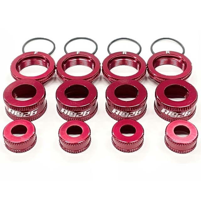 ■ダンパーカラーチェンジキットは、キャップナット、キャップエンド、アジャストナット、アジャストナット用Oリングが各4個入りの1台分のキットです。