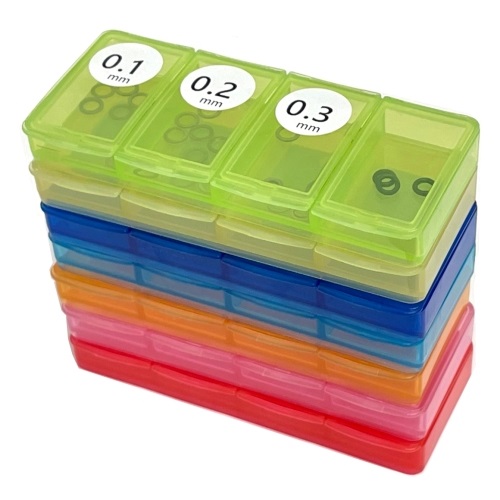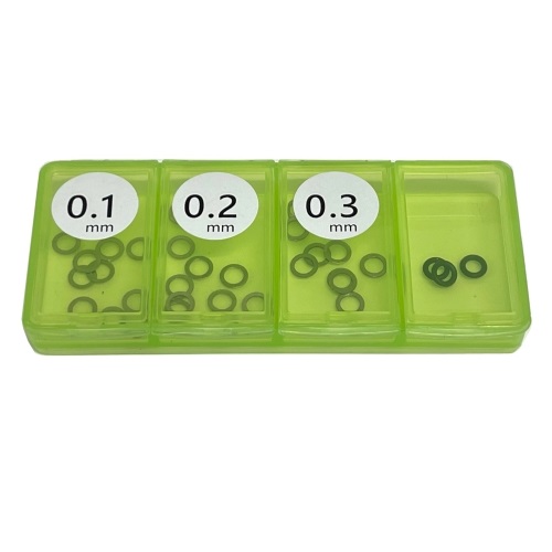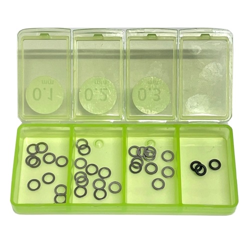 ケースを4部屋タイプにし、0.1mm/0.2mm/0.3mm厚の3種類のシムにさらに Oリングを追加 致しました。