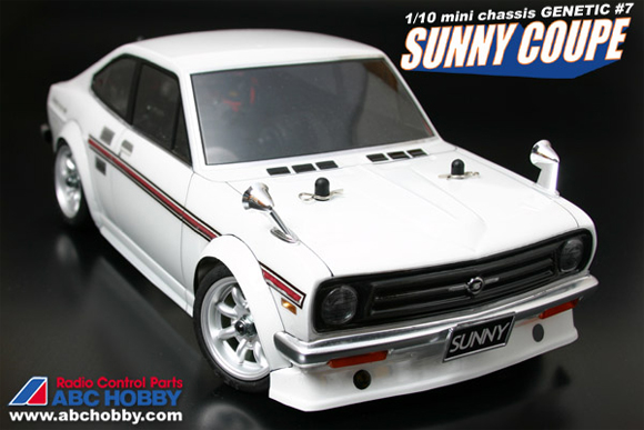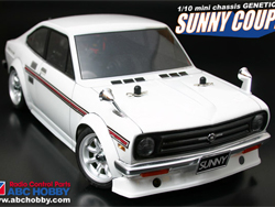 これにより『サニーと言えばレース』というイメージが若者に浸透し、当時こぞって太いタイヤを履かせ、TS風フロントスポイラーを取り付け、一生懸命ハンマーでフェンダーを叩き出した、そんな懐かしい思い出をプレイバックするABCホビー1/10ミニシャーシ<ジェネティック>第七弾サニークーペ。シンプルで力強いシルエットをリトルスポーツで再現!海外仕様のダットサン1200クーペのエンブレムもデカールに収録し、細かいバージョンの再現も可能です。