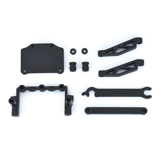 セットにはバッテリーホルダー、バッテリープレート、バッテリーポスト部品2個、バッテリースペーサー(丸型)2個、バッテリースペーサー(バー型)、シャーシブレース2個が含まれます。