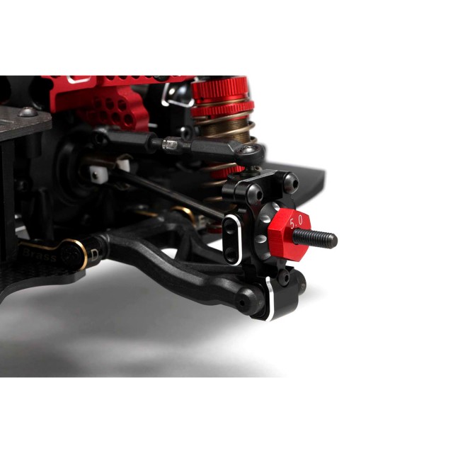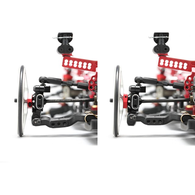 このリヤハブキャリアセットでは、アッパー / ロアアームの取り付け位置が選択できるのも特徴で、アッパー側は別パーツにすることでアッパーアームの長さをバリアブルに変更可能とし、ロール時の接地面変化をコントロールしやすく、特に P タイルなどの路面で有効なセッティングポイントとなります。ロアアームは取り付け高さを 4 ポジションから選択できるので、ロールセンターの設定幅が大きく広がり、リヤ周りのウエイト調整などとも相性抜群です。