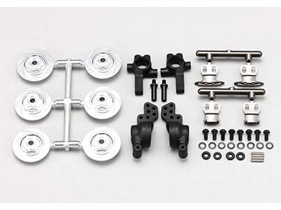 セットには樹脂製のステアリングブロックとリヤハブキャリアも付属しますが、キャリパーを取り付けやすくするとともに、それぞれ最新のセッティングに合わせた形状となっています。ステアリングブロックは実車の構造を参考に最適なトレールとキングピンアングルを設定し、カウンターステア中のルックスを高めながら、ステアリングレスポンスも向上しています。ステアリングストッパーやタイロッド取り付け位置も最新仕様にモデファイし、切れ角を上げた際の作動も滑らかに仕上がります。リヤハブキャリアはアッパーアームの取り付け位置を増設し、ロールセンターや対地キャンバー変化の設定幅を増やして、積極的にロールを活用するセッティングが可能になっています。特にPタイルなどのグリップが低い路面では、アッパーアーム取り付け位置を高くすることでシャーシがロールした際の接地面積を保ち、横方向への安定したグリップを確保してアグレッシブな走行を実現しています。