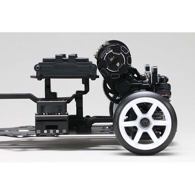 専用のステーにより、タイヤハイトを超える位置まで高められたバッテリーポジション。ESCの搭載もリヤ寄りにすることが可能で、重量バランスの選択幅が大きく広がります。
