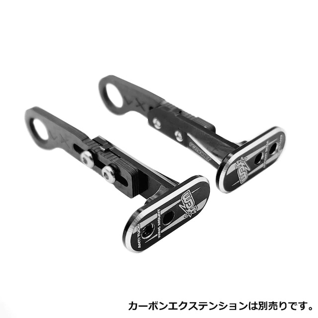マウントパーツは7075ジュラルミンを使用することで耐久性を向上し、ナットを廃止することでパーツ点数を少なくし軽量化(6.5g/ペア)と耐久性の両立を実現しました。さらにカーボンエクステンションを固定するためにピンを追加し1mm単位で左右均等に調整することを可能にしました。