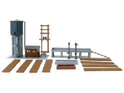 機関区に必要な給水タンク、ポンプ小屋、スポート、給炭台、給砂箱廃炭用ピット、枕木を連結した作業員用歩道をセットした組立キットです