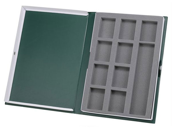 ● 中敷にはサウンドカードとサウンドカードに付属するファンクションラベルを一緒に収めることができるスペースが9ヶ所と、ピンセットや細めのドライバー、線路・車両クリーニング用の綿棒などの工具を収めることができる長めのスペース1ヶ所で構成されています