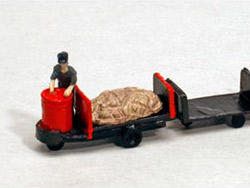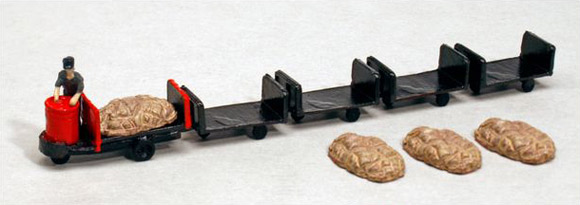 ・ターレット式駅構内運搬車1台と連結用の台車4台(模型は連結できません)と運転士1人。荷物4個、デカール付。
