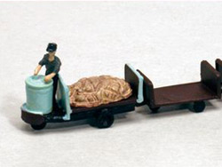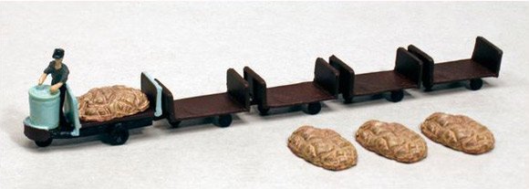 ・ターレット式駅構内運搬車1台と連結用の台車4台(模型は連結できません)と運転士1人。荷物4個、デカール付。