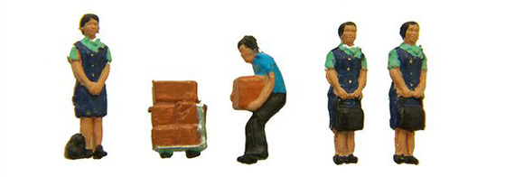 ● (N)人形 アテンダント(寝台特急:準備)・・・寝台特急出発前の準備をまとめた4体+台車