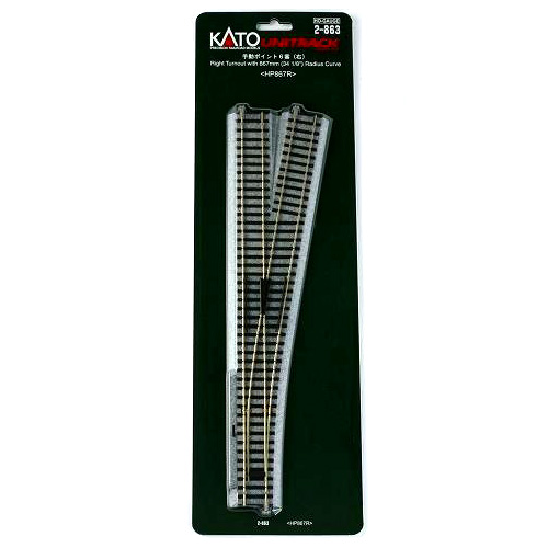 手動ポイント6番(右) 867mm <HP867R> [2-863]] メーカー KATO 品番 2-863 商品名 手動ポイント6番(右) 867mm <HP867R> [2-863]] 定価(税込) ¥ 3,630 特価(税込) ¥ 2,723 送料区分 送料中① 送料中① 基本配送料:935円 数量が5点まで935円、6点1セットにつき「送料大② 1,100円」 利用規約(送料説明)の表示 ※詳しい送料説明 オンラインショップの在庫状況 オンラインショップ 在庫わずか 店舗別の在庫状況 大阪日本橋店 在庫わずか 東京秋葉原店 在庫切れ 福岡博多店 在庫切れ 【有料】ラッピングサービス ラッピングサービスを希望される場合は、商品と一緒に対応するサイズのラッピングサービスをカートに入れてご注文ください。 ラッピングをご希望の方はこちら 数量 個 この商品へのお問い合わせ 手動ポイント6番〈HP867L/R〉は、電動ポイント6番と基本線路規格は同一で、補助線路の一部を整理してポイント本体部と一体化することにより、シンプルな取り扱いができるようにしてあります。分岐側曲線に半径R867mmを採用していますので、長編成列車や大形車両の通過も容易です。また、別売のポイントマシンを装着することにより、簡単に電動ポイント化することもできます。