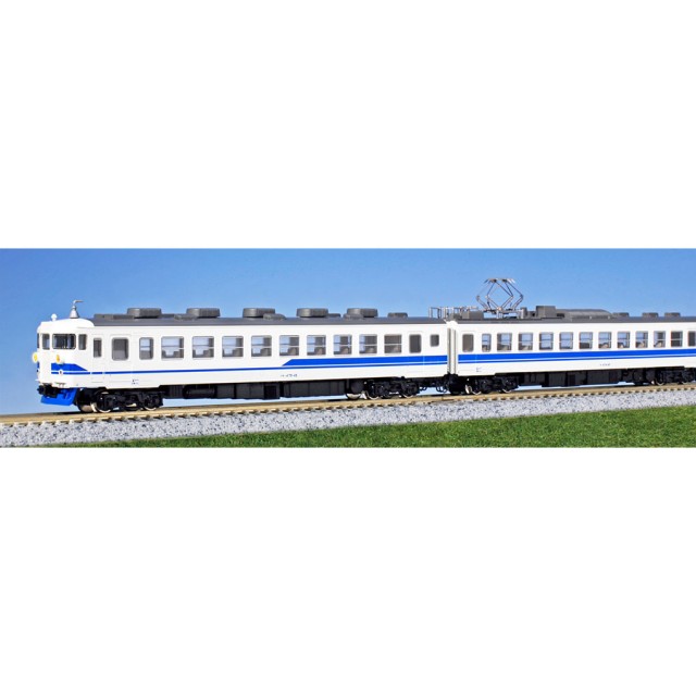 ● JR西日本の北陸本線で活躍する、オイスターホワイトにコバルトブルーのラインが入った北陸色を475系で再現。