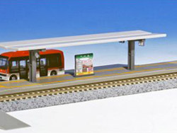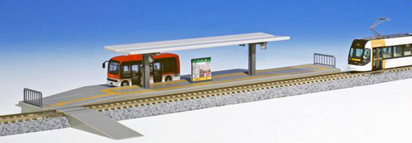 ・富山ライトレールに代表される低床式のLRV車両が発着する郊外駅のイメージを再現。 ・ユニトラックを使用した専用軌道上のホームと同一面で乗換えが可能なバス停が再現できるスロープが付属。