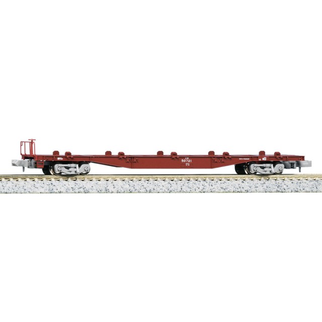 実車は昭和46年(1971)から51年(1976)にかけて製造された国鉄形コンテナ貨車で、改良を加えながら現在でもJR形のコキ100系とともに活躍を続けています。外観の大きな特徴として、JR化後に換装されたグレー塗装の改良形の台車を装着しています。