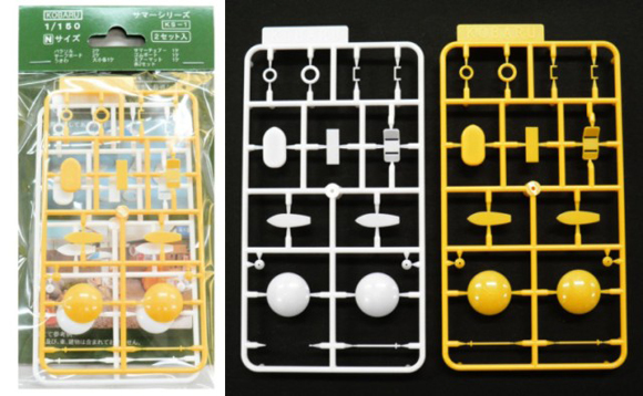 パラソル、サマーベッド、サーフボード、浮き輪など海の情景には欠かせない小物のセット。成形色を活かせるブルーバージョン