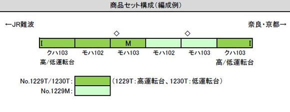 - JR103系関西形 ウグイス 高運転台車 4両編成動力付きトータルセット(塗装済キット) [1229T]]
