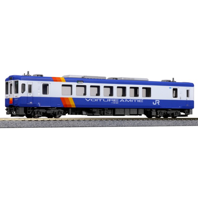 平成29年(2017)の信州デスティネーションキャンペーンの一環として、飯山線のキハ110のうちの2両がリバイバル飯山線色として、1991?1997年に運転されていた飯山線の車両の色をまとって登場しました。青と白を基調に、前面の貫通扉の下部分と車体側面に斜めに入ったラインの暖色の色合いは、キハ110の軽快なイメージにも合い、爽やかな印象をあたえる車両です。車体に記された「VOITURE AMITIE’」は「友情の列車」という意味です。