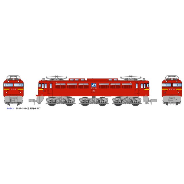 片側の運転台に貫通扉と作業用のデッキが設置されたほか、チョッパ制御が採用されて粘着性能が向上したのが大きな特長です。車体色は広島地区にちなみ紅葉色が採用されました。国鉄分割民営化後にEF61- 200番台の置き換え用として増備されたEF67はEF65が種車で、貫通扉やデッキの設置が省略されたことから100番台として区分されています。