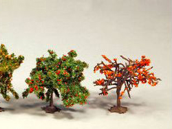 植込ブロックを模したベースにセットされており、レイアウトの道路脇やジオタウンの歩道などに両面テープや接着剤で簡単に設置できます。樹木の高さは約40mm?65mmと手ごろなサイズで、根本には支柱も表現されています。ジオタウンはもちろん、レイアウト全般や各種ジオラマの街路樹として、幅広くご使用になれます。