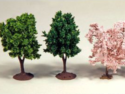 植込ブロックを模したベースにセットされており、レイアウトの道路脇やジオタウンの歩道などに両面テープや接着剤で簡単に設置できます。樹木の高さは約40mm?65mmと手ごろなサイズで、根本には支柱も表現されています。ジオタウンはもちろん、レイアウト全般や各種ジオラマの街路樹として、幅広くご使用になれます。