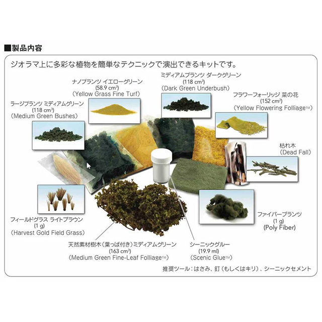 ジオラマ上に多彩な植物を簡単なテクニックで演出できるキットです。