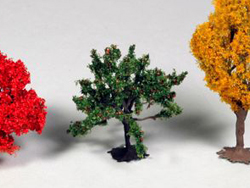 植込ブロックを模したベースにセットされており、レイアウトの道路脇やジオタウンの歩道などに両面テープや接着剤で簡単に設置できます。樹木の高さは約40mm?65mmと手ごろなサイズで、根本には支柱も表現されています。ジオタウンはもちろん、レイアウト全般や各種ジオラマの街路樹として、幅広くご使用になれます。
