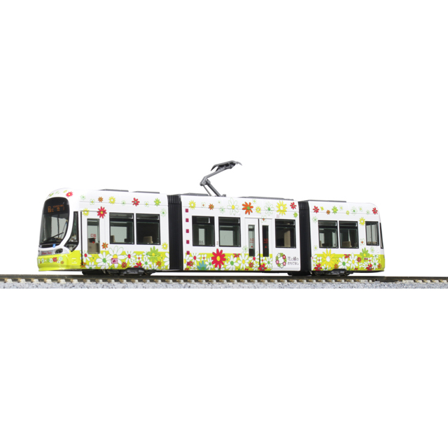 1001号車は平成31年(令和元年・2019)4月以降、広島電鉄グループの広電バスと同様の塗色にラッピングの上運用されています。シックな緑色の塗分けとストライプをまとっていますが、前面・側面の各1面のみのラッピングで、それ以外は通常塗装というユニークなパターンが特徴です。1002号車は毎年5月に広島市内で開催される「ひろしまフラワーフェスティバル」にちなんで、平成28年(2016)4月に「フラワートレイン」のフルラッピングに変更され、現在も活躍しています。