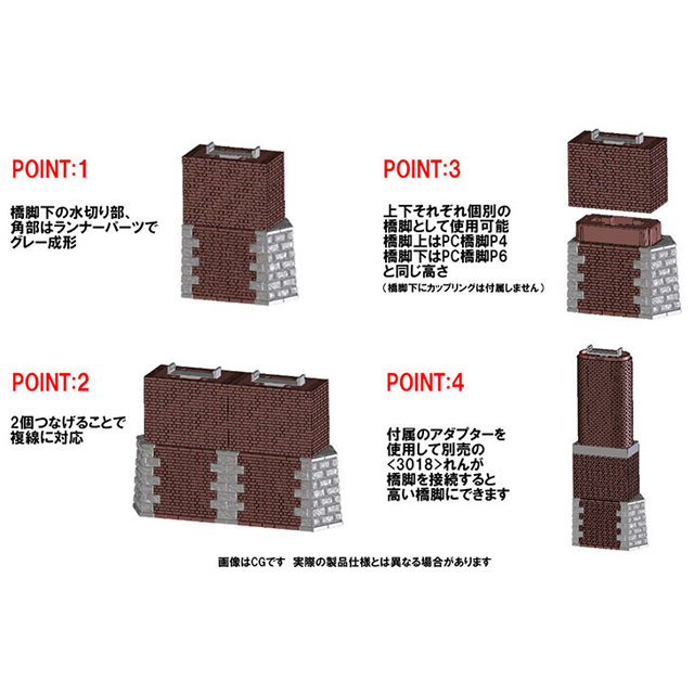 ●付属のアダプターAを使用して本製品の上に別売の<3018>れんが橋脚を接続することで通常の橋脚より高くすることが可能