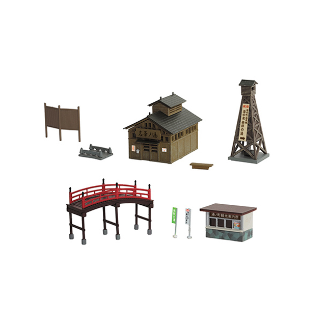 共同浴場、観光案内所、源泉減圧塔、太鼓橋、石橋、露天風呂目隠し、縁台、のぼり×2、シール
