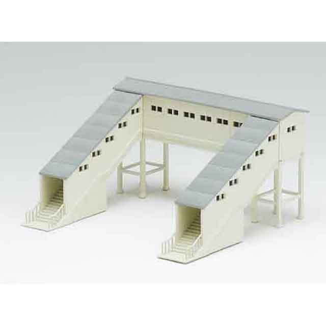 ・駅利用者がホームとホームの間を線路上空で横切るための跨線人道橋。昭和中期以降に新建材で建設され全国各地で見られるポピュラーな形態