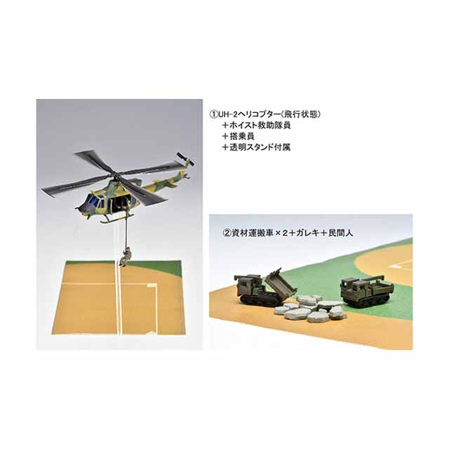 UH-2ヘリコプターの飛行状態の再現や、付属するフィギュア小物を組み合わせて各種シーンを再現可能!